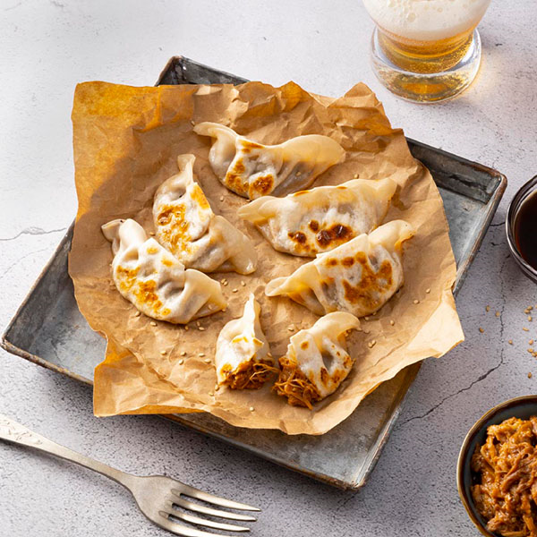 Gyoza pulled pork BBQ. Fuses the American culture and the Asian flavours of vegetables and soy.