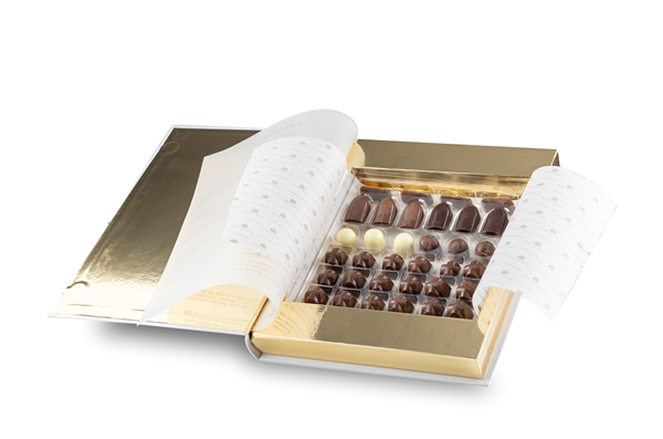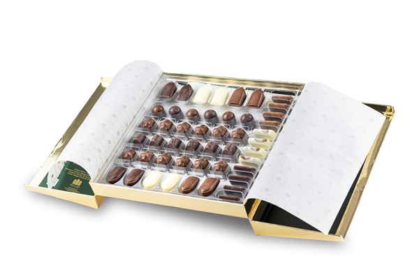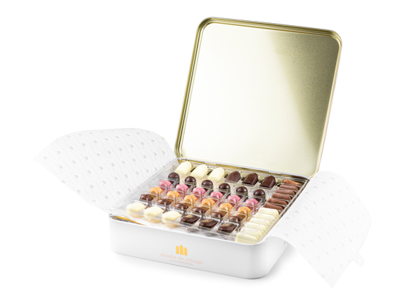 Caja metálica de dos pisos de 48 bombones surtidos (96 unidades). Sin gluten.