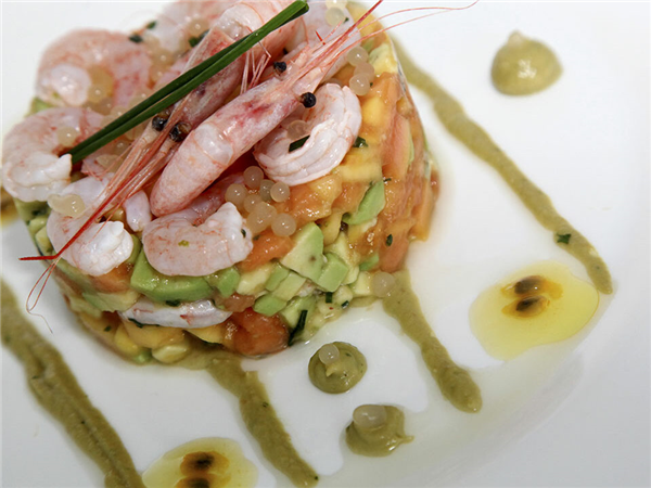 Tapas to taste: Motril prawns, tomato gelée, citrus caviar and spring herb oil / Gurullos stew and pajuna beef tongue with aerated Thermidor sauce.